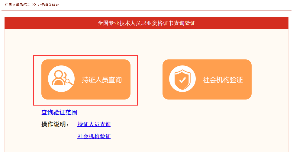點擊【證書查詢驗證】——【持證人員查詢】,進入【全國專業(yè)技術人員職業(yè)資格證書查詢驗證系統(tǒng)(持證人員查詢)】平臺。