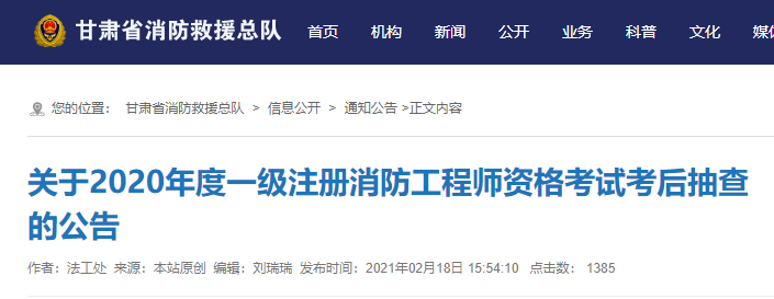 為切實加強(qiáng)事中事后監(jiān)管,確保告知承諾制試點工作順利推進(jìn),根據(jù)人社部人事考試中心《關(guān)于專業(yè)技術(shù)人員資格考試報名證明事項告知承諾制試點后續(xù)工作有關(guān)問題的通知》(人考中心函〔2019〕68號)和省人社廳、省消防救援總隊《關(guān)于2020年度一級注冊消防工程師資格考試報名工作的通知》(甘人社通〔2020〕278號)要求,現(xiàn)將2020年度一級注冊消防工程師資格考試考后抽查工作公告如下: