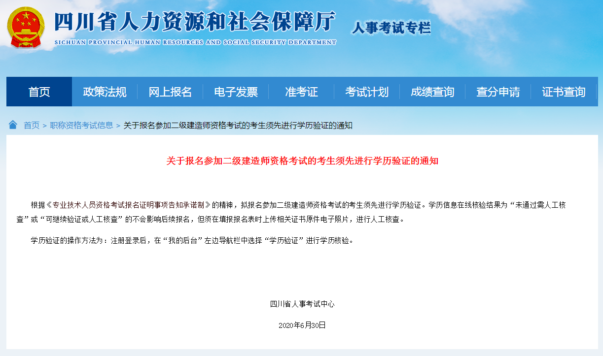 四川省人力資源和社會(huì)保障廳網(wǎng)站發(fā)布通知,擬報(bào)名參加二級(jí)建造師資格考試的考生須先進(jìn)行學(xué)歷驗(yàn)證。