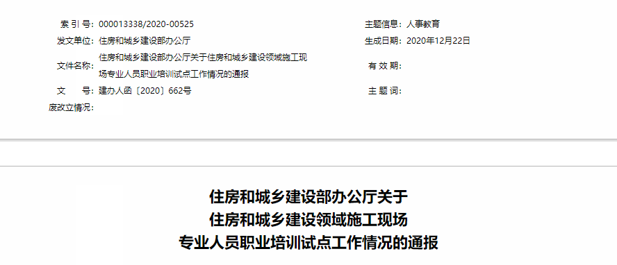近日,住建部發(fā)布《關于住房和城鄉(xiāng)建設領域施工現場專業(yè)人員職業(yè)培訓試點工作情況的通報》。《通報》明確:組織編制了全國統(tǒng)一培訓測試題庫,并依據試運行情況,對系統(tǒng)和題庫進行了完善,供各地免費使用。