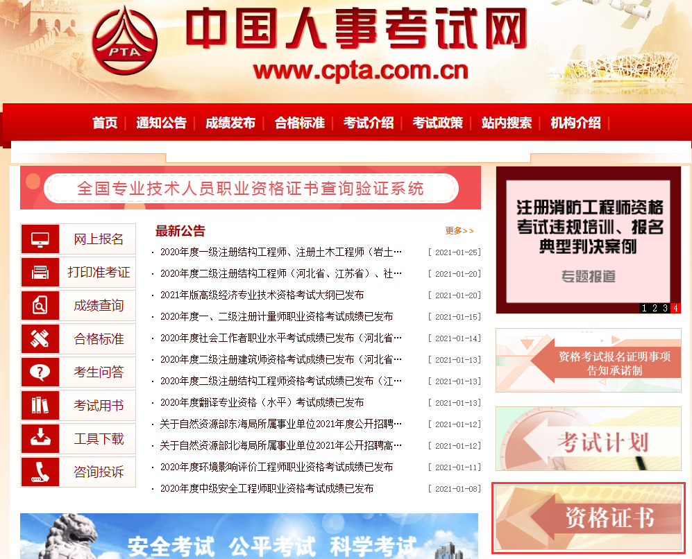 登錄中國人事考試網(wǎng)(www.cpta.com.cn),點(diǎn)擊【資格證書】。